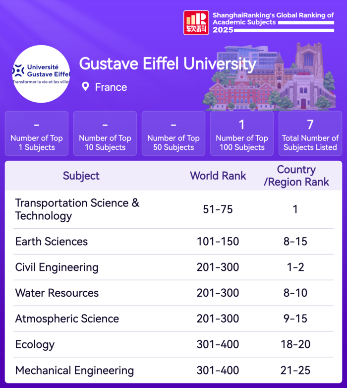 Classement thématique de Shanghai 2025 : l’Université Gustave Eiffel conforte sa place parmi les meilleures universités mondiales